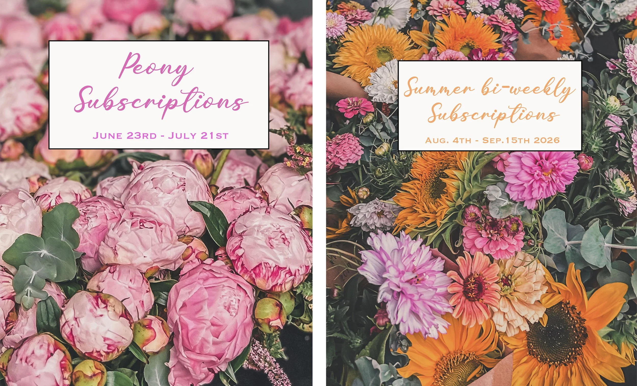 Small Business Saturday Special Sale Price: $126.00 Original Price: $140.00 Sold out Peony bi-weekly bouquet subscription $60.00 Summer Bi weekly Flower Subscription $80.00 Eucalyptus bunch $10.00 Sold out Bouquet $25.00 Sold out Mini bouquet $10.00 Sold out Gift Card from $20.00 DIY Flower Bucket $100.00 Add Fresh flowers that are in season to your handmade pottery piece $20.00 Sold out